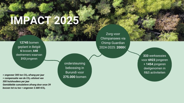 Jouw donatie wordt gebruikt voor het herstellen van de natuur in België en Afrika, en om hulp en bescherming aan chimpanzees te bieden. Wij vinden het belangrijk transparant te zijn over de impact van uw donatie. Een volledig overzicht van hoe je donatie wordt gebruikt kan je nalezen in ons jaarrapport.