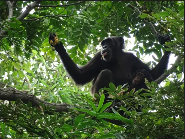 Hiila was the first chimpanzee in this area of Senegal to allow Paula and Wandou to gradually get to know her life. One morning, the research team saw a group of chimpanzees eating, but when they detected the team’s presence, they slowly retreated. One male stopped when he reached the ground and looked intently at a tree for a few seconds, then moved on and left. This last gesture of the male gave away Hiila’s position, lying in a nest in the same tree. Hiila turned her head slightly to look sidelong at the team and then settled back into the nest, lying on her side, her back to them. After waiting a few minutes, and as Hiila was calm, the team moved a few metres further up the slope in search of a better viewing angle. Hiila glanced sideways at them again and again rearranged herself so that her back was completely to the team’s new position. Amanda and Wandou thought something was wrong with Hiila, as she had never had such a dodgy reaction before, so they both grabbed the binoculars to try and see what was wrong. It took them about 45 minutes to figure it out: when Hiila had rearranged herself, Wandou and Amanda saw a small hand, very pink and tiny, clutching tightly to Hiila’s belly hair. Wandou and Amanda saw it at the same time, and after looking at each other, whispered at the same time: “Did you see that? The team decided to back off a little and give Hiila some leeway. After a good while, Hiila sat up and turned directly towards the team, with the little one clutched to her belly, as if showing it off, looking intermittently at her newborn and the team. The baby appeared to be tremendously fragile, very small, with pink skin, very wrinkled, and still a little purple in places. His hair, still a little damp, very black and shiny, contrasted sharply with the pink of his skin. The little boy had his eyes closed and yawned, making the team even more aware of how small he was. Wandou, an older man of few words, looked at Hiila excitedly, with that tender gaze with which he looks at his young children. Then, somewhat embarrassed by the moment, he smiled shyly and said in French: “Amanda, write in the notebook! Hiila has had a baby! You have to write a lot! It’s a very important day!” Cheempo was born.